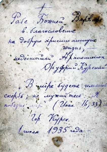 Итак, одной из монахинь, постриженных игуменом Мартинианом, была мама священномученика Онуфрия Екатерина Осиповна. В постриге она получила имя Наталия. После ареста сына монахиня Наталия осталась в Курске, где и упокоилась в марте 1938 года. Похоронена она на кладбище у Никитского храма.
